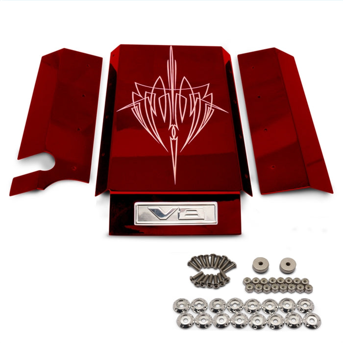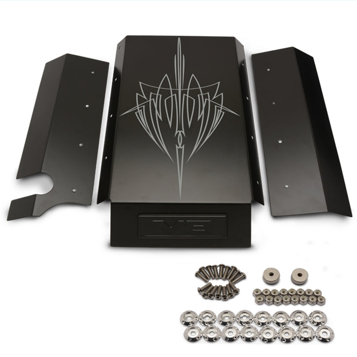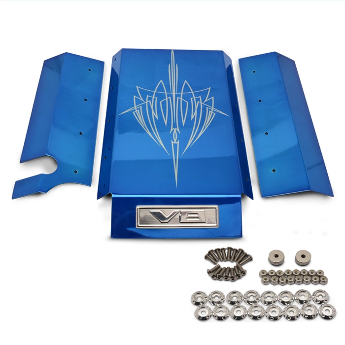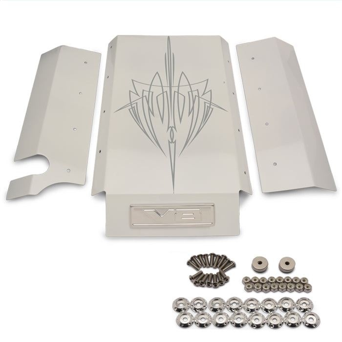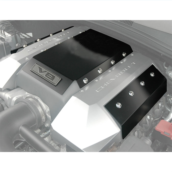 Add a little WOW to your engine bay by installing one of our engine cowl dress-up kits on YOUR STOCK PLASTIC COVER, found on 2010-2015 Camaros. These kits are made of aluminum and come complete with all stainless steel fasteners, billet aluminum accent washers, and a billet V-8 badge on the front.