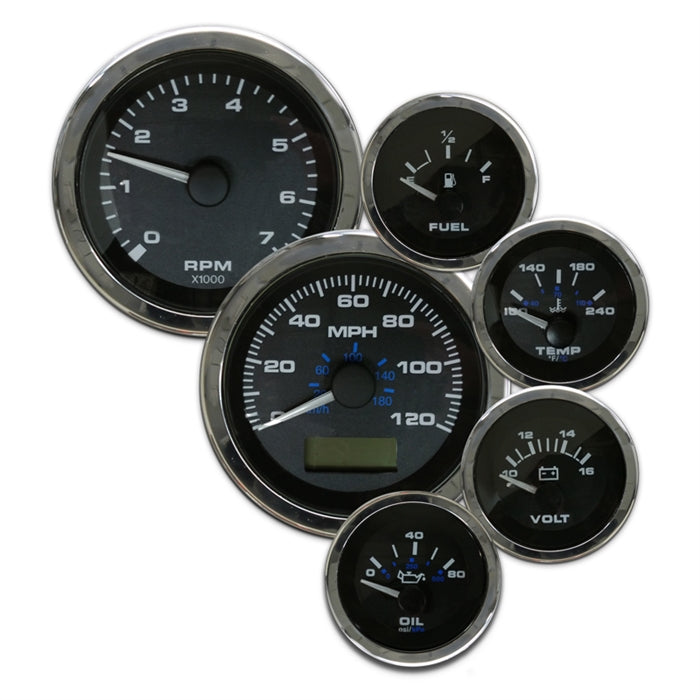 This six gauge kit includes a 120 MPH GPS controlled Speedometer and receiver that is accurate with any gear ratio or tire size and requires NO cables or transmission senders to function. Kits also include 7000 RPM tach, water temp and oil pressure gauges with senders, voltmeter, fuel level gauge compatible with Ford senders, and a momentary function switch. Sizes: Tach and Speedometer are 3-3/8", smaller gauges are 2-1/16.