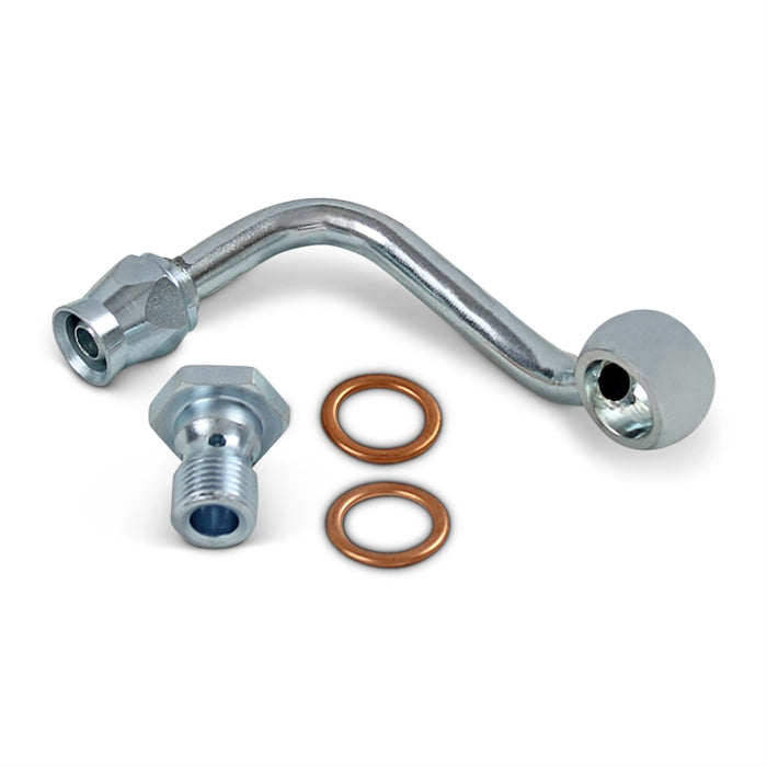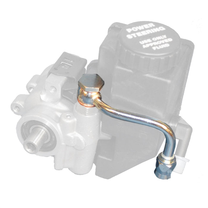 This power steering hardline is used on GM type II power steering pumps with attached reservoirs and wraps to the side of the tank for easy access. The integral banjo fitting has 16.5mm x 1.5 threads and the line includes a nut and ferrule for attaching -6 Teflon lined braided stainless steel hose. NOTE: Only compatible with hose with a .030" wall thickness.
