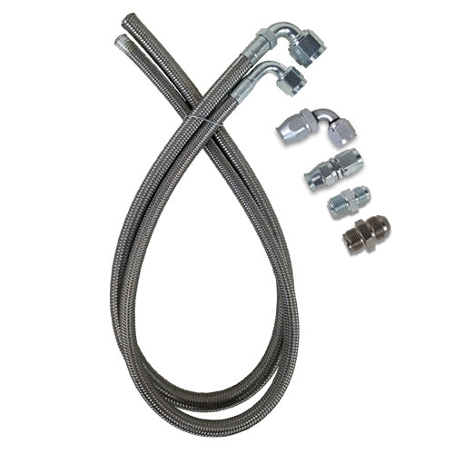 Eddie Motorsports' power steering hose kits feature high-quality, Teflon-lined stainless steel hoses designed to handle the high-pressure demands of your steering system. This kit is for use with Eddie Motorsports pulley kits with billet aluminum attached power steering reservoir with -8 return fitting and 1965-1979 GM power steering gearbox. The kit includes two 28" braided stainless steel/ Teflon lines, each with one crimped-on 90 degree hose end, and all of the necessary fittings. Installation requires cutting the two hoses to length and installing screw-together hose ends.