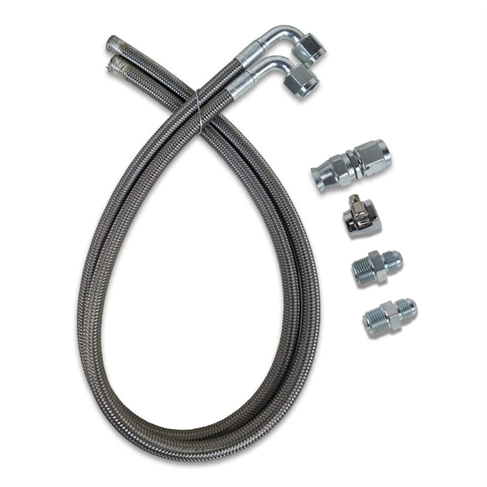 Eddie Motorsports' power steering hose kits feature high-quality, Teflon-lined stainless steel hoses designed to handle the high-pressure demands of your steering system. This kit is for use with Eddie Motorsports pulley kits with plastic attached power steering reservoir with 3/8" slip-on return fitting and 1980 and newer GM power steering gearbox. The kit includes two 28" braided stainless steel/teflon lines, each with one crimped-on 90 degree hose end, and all of the necessary fittings. Installation requires cutting the two hoses to length and installing screw-together hose ends.