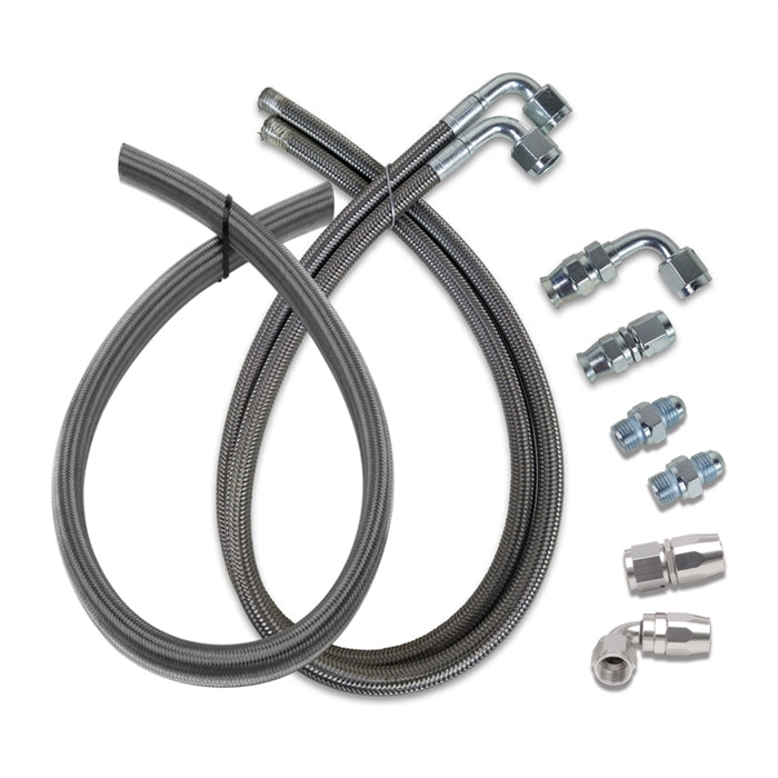 Eddie Motorsports' power steering hose kits feature high-quality, Teflon-lined stainless steel hoses designed to handle the high-pressure demands of your steering system. This kit is for use with Eddie Motorsports pulley kits with plastic attached power steering reservoir with 3/8" slip-on return fitting and Ford/TRW rack and pinion steering (used with most popular aftermarket Mustang II suspension systems). Includes two 28" braided stainless steel/teflon lines and all of the necessary fittings. Installation requires cutting the two hoses to length and installing screw-together hose ends.