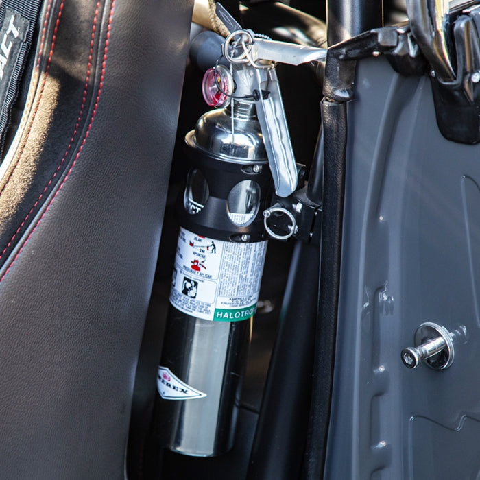 Our fire extinguisher bracket's unique construction and function is unsurpassed by others. These brackets are CNC machined from 6061-T6 aluminum and have been built to allow for mounting in any position. The round portion of the bracket is clamped permanently to the extinguisher (sold separately). The bracket is mounted to 1-3/4" roll bar tubing with four fasteners and a quick release pin allows the extinguisher to be quickly and easily removed from the mount base. These large brackets are manufactured to work with our 2.5lb. (3"O.D.) extinguishers.