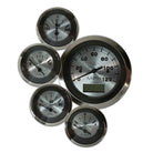 This five gauge kit includes a 120 MPH GPS controlled Speedometer and receiver that is accurate with any gear ratio or tire size and requires NO cables or transmission senders to function. Kits also include water temp and oil pressure gauges with senders, voltmeter, fuel level gauge compatible with Ford senders, and a momentary function switch. Sizes: Tach and Speedometer are 3-3/8", smaller gauges are 2-1/16.