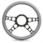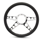 Eddie Motorsport's Racer 4 Spoke model steering wheel has highly polished spokes with a black grip. These wheels are precision CNC-machined in the USA from high quality 6061-T6 billet aluminum. The wheels are 13 1/2 diameter and include a synthetic leather half wrap grip. GM, Ford, or Mopar adapters and horn buttons are available and sold separately.