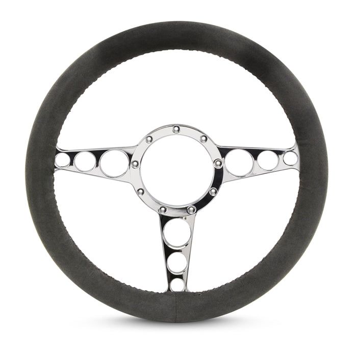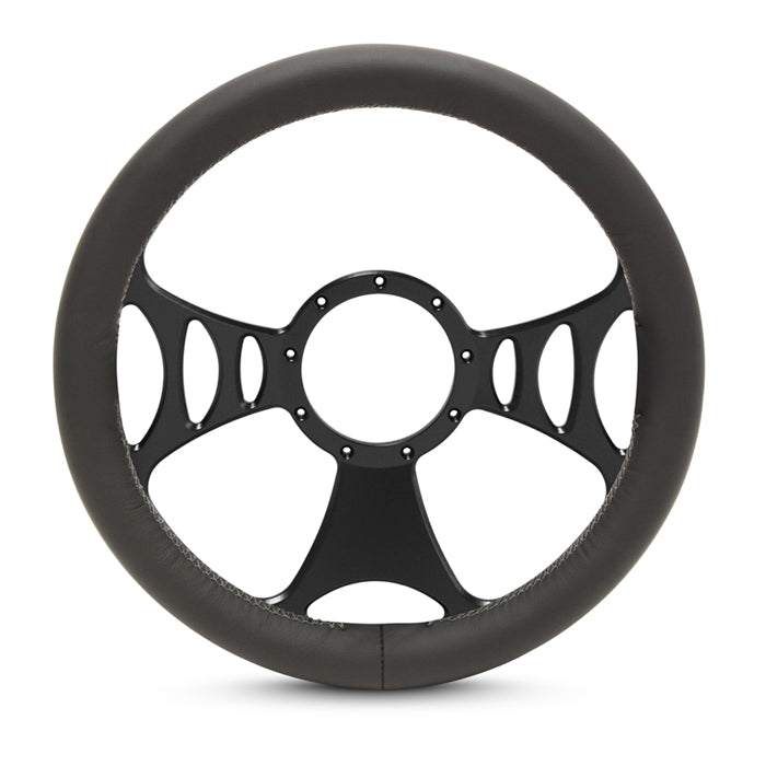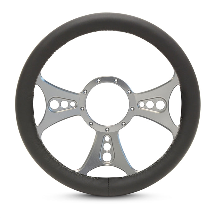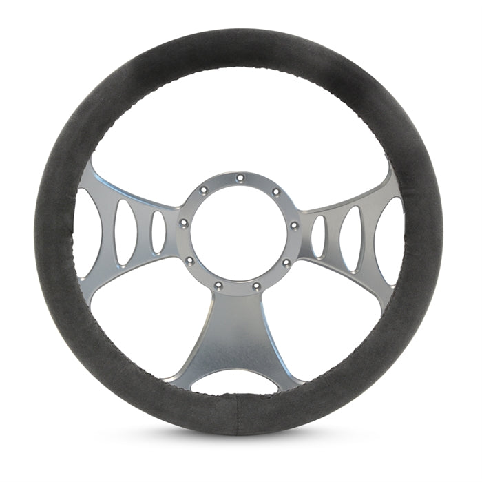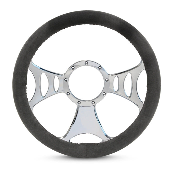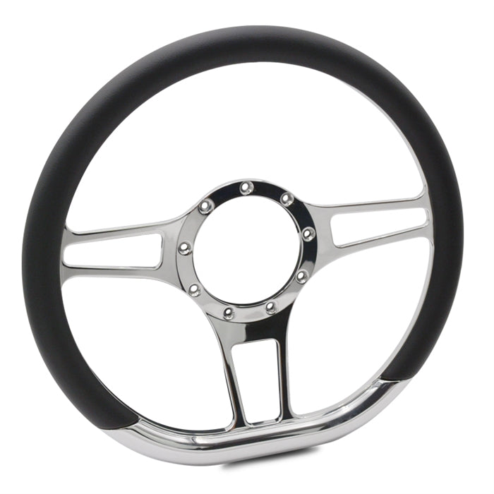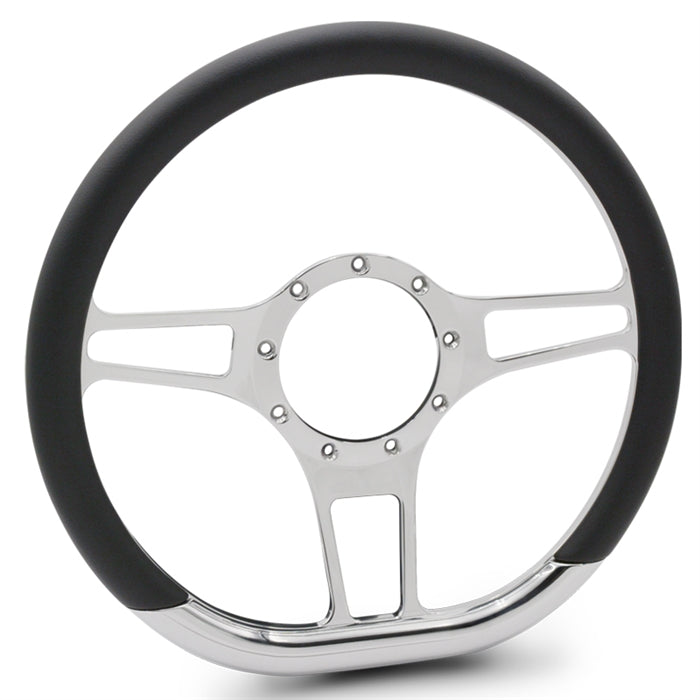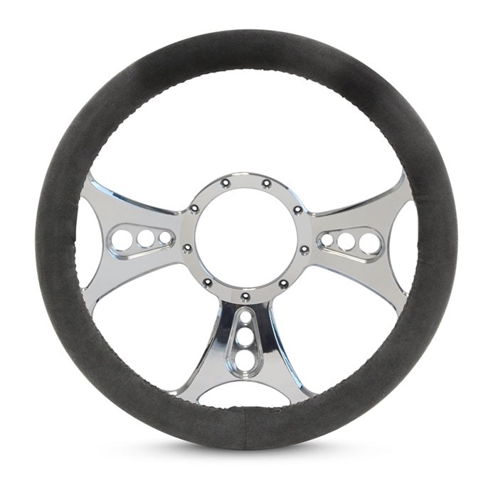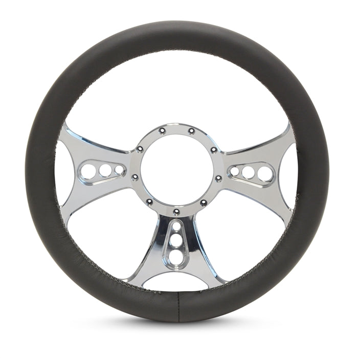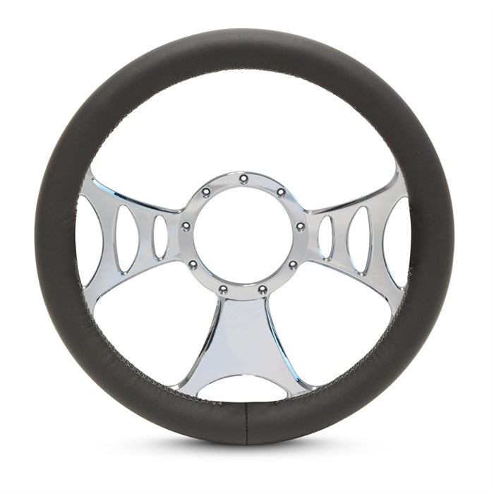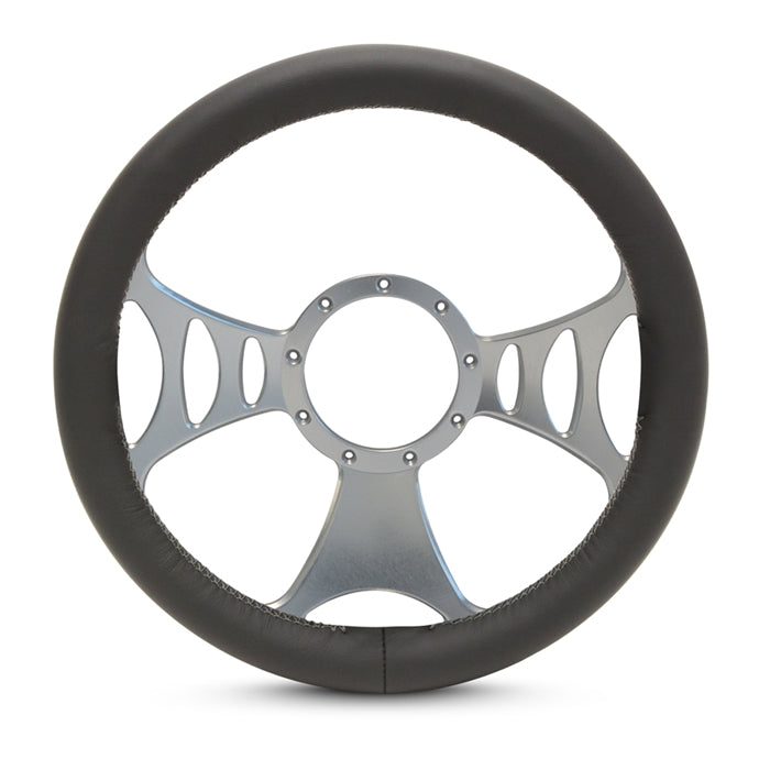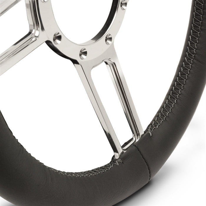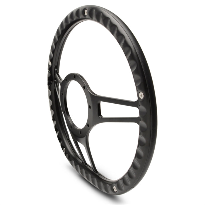 Eddie Motorsports newest product line is our affordable high quality billet aluminum steering wheels. These wheels are CNC machined in our Southern California facility. They can be purchased with a raw machined or highly polished finish or with one our Fusioncoat colors. The half-wrap grips are included in the price and are available in black, gray, tan, and red (specify when ordering). You can also wrap the wheel with your interior's matching leather or vinyl. The wheels are 13-1/2" in diameter. GM adapters and horn buttons are available and sold separately. Look for many new steering wheel models from Eddie Motorsports in the very near future!