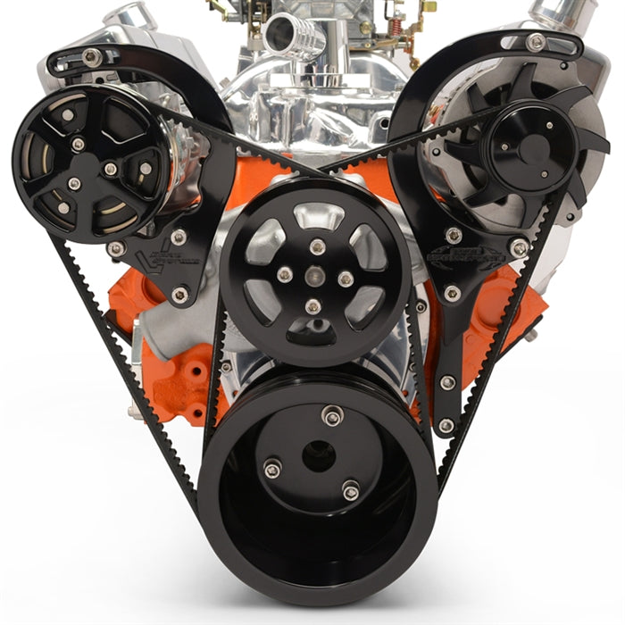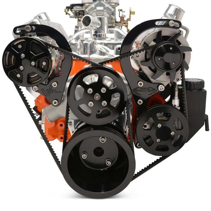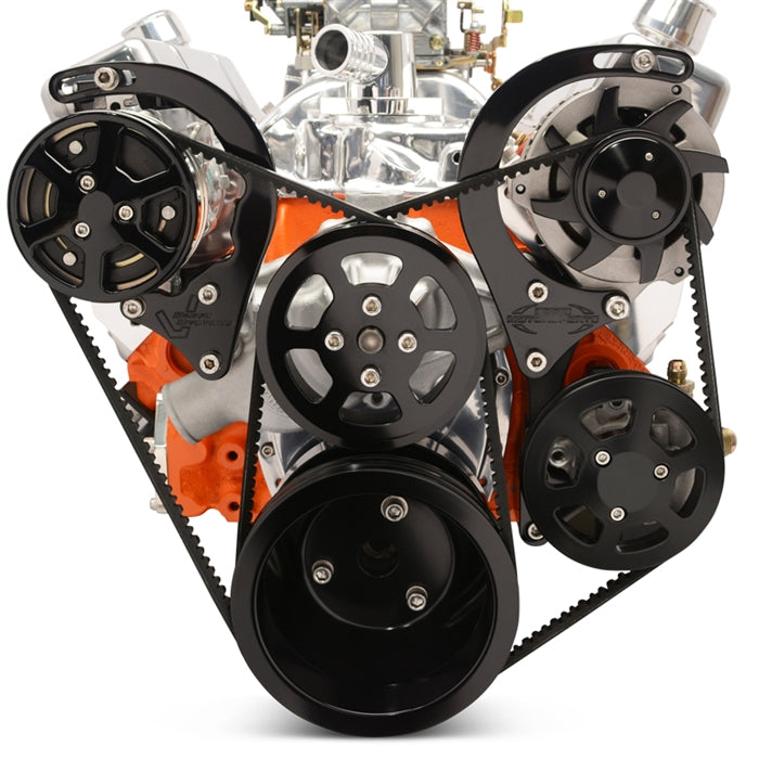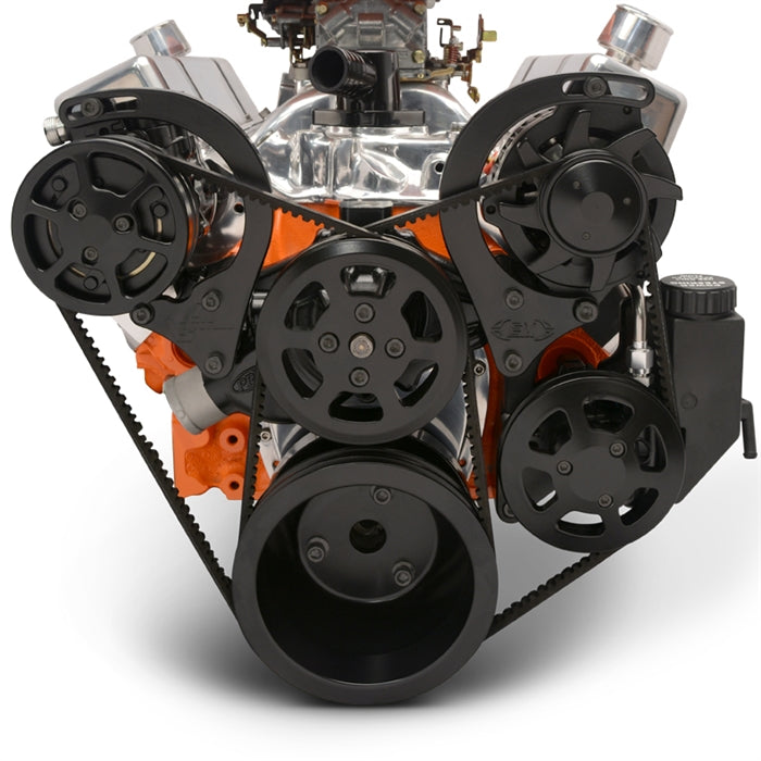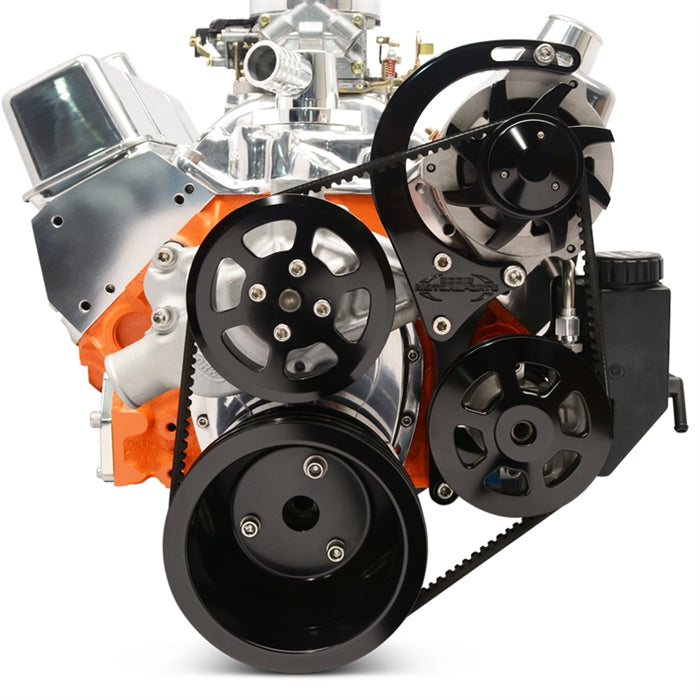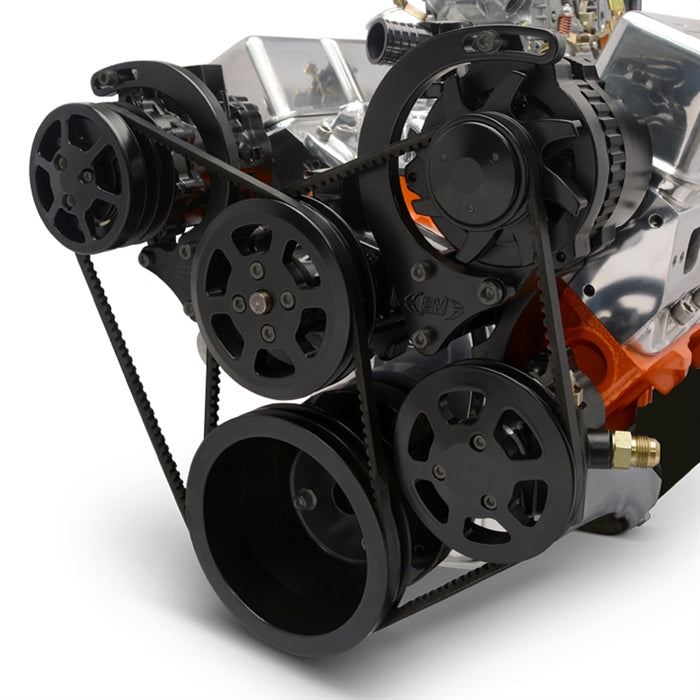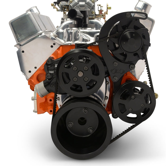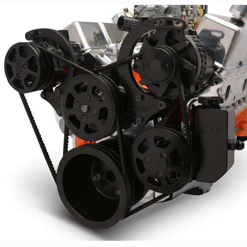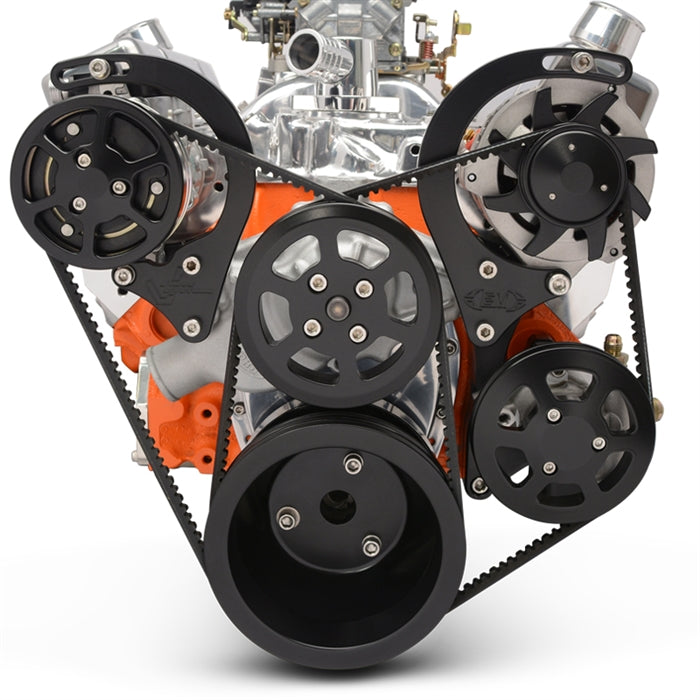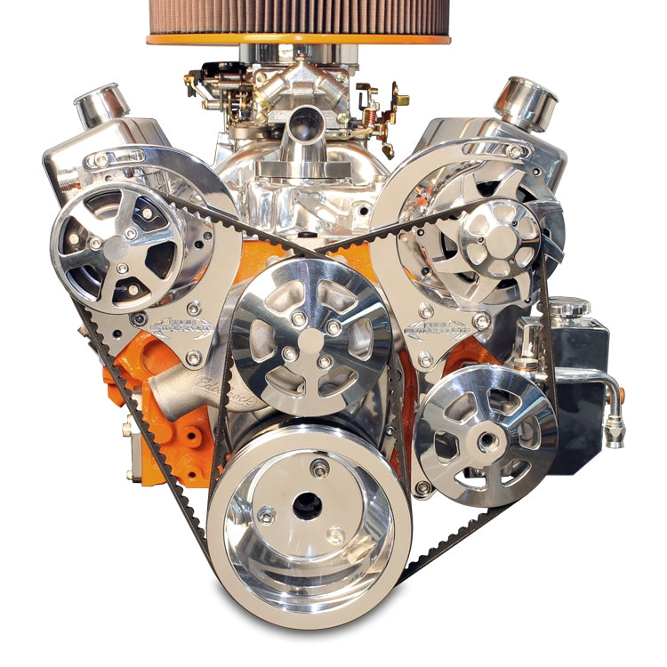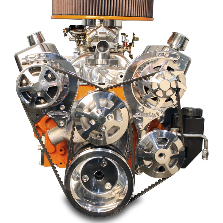 Our New V Drive Systems offer the same complete, compact design and simple installation as our popular Serpentine Drive systems at a more affordable price. One part number gives you everything you need to accessorize your engine with American made billet aluminum and new, name brand components. Kit is equipped to work with electric or mechanical fans.