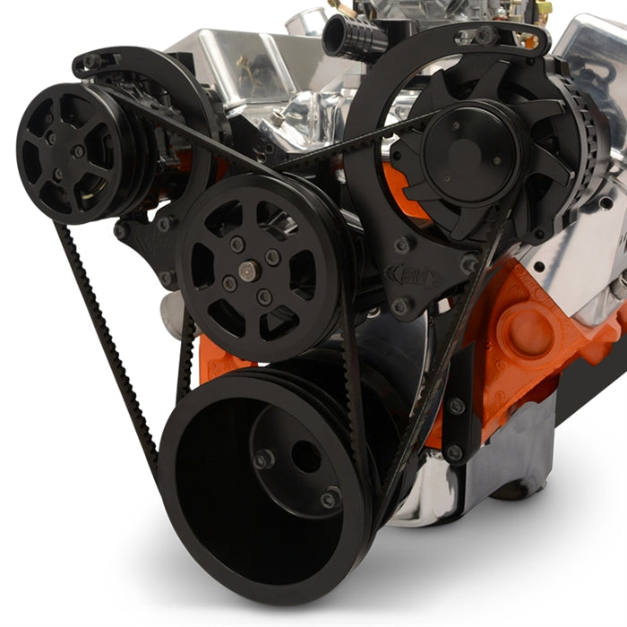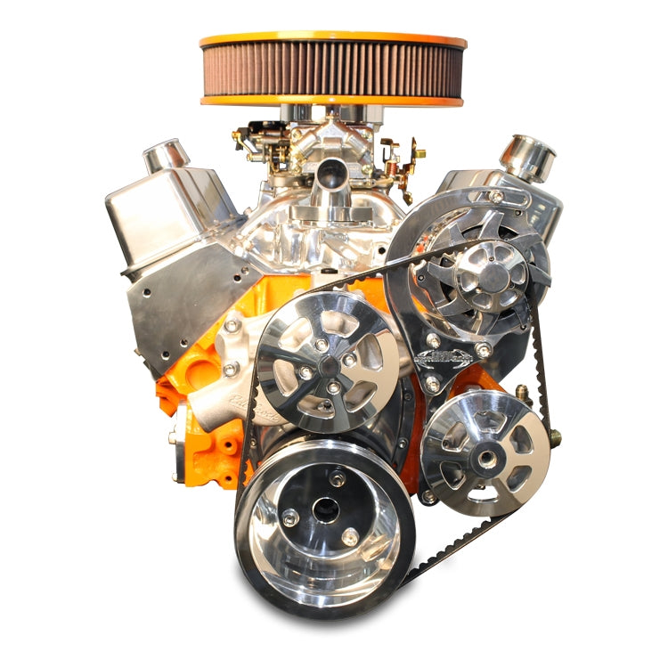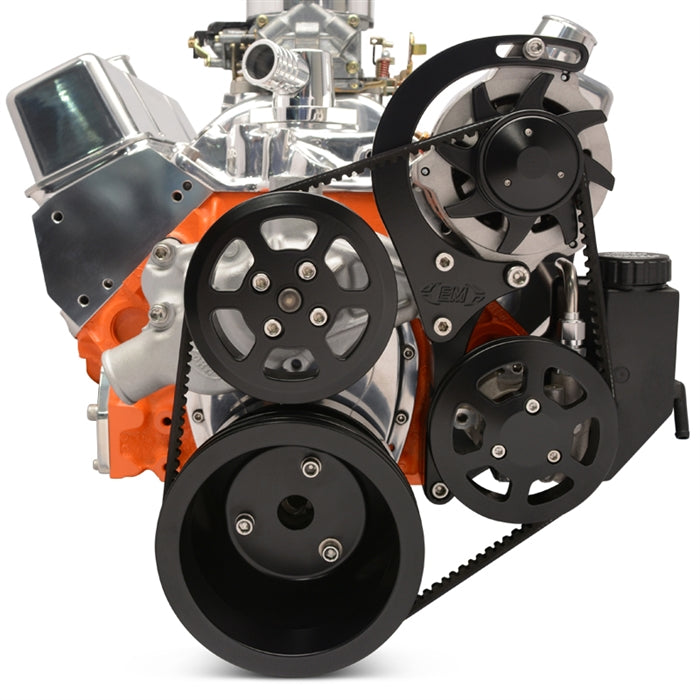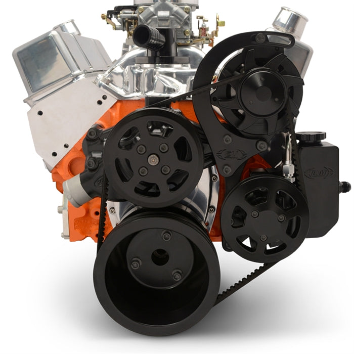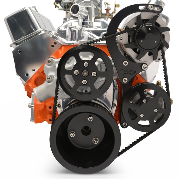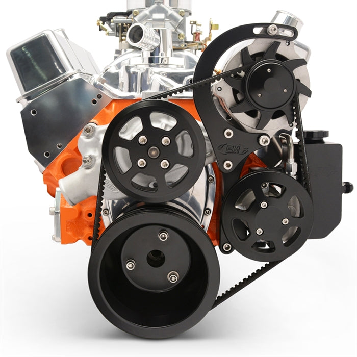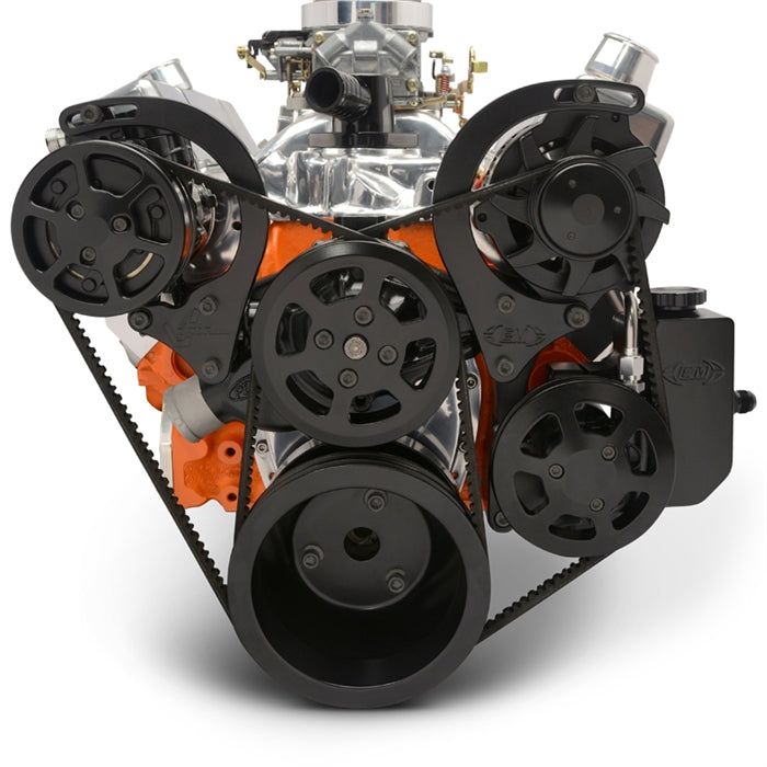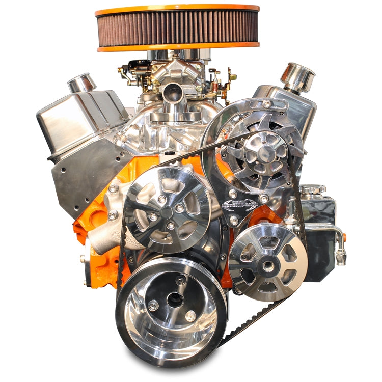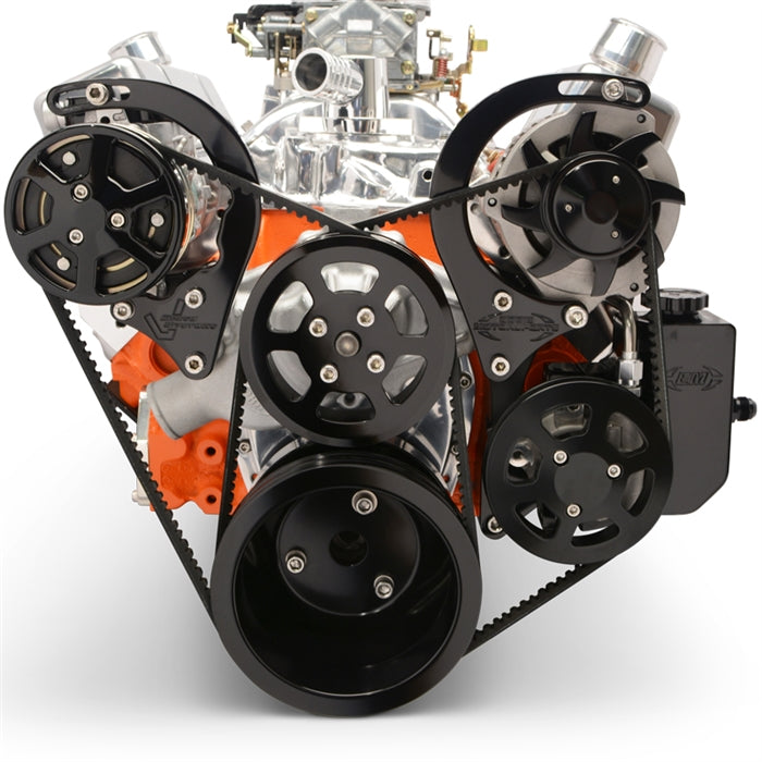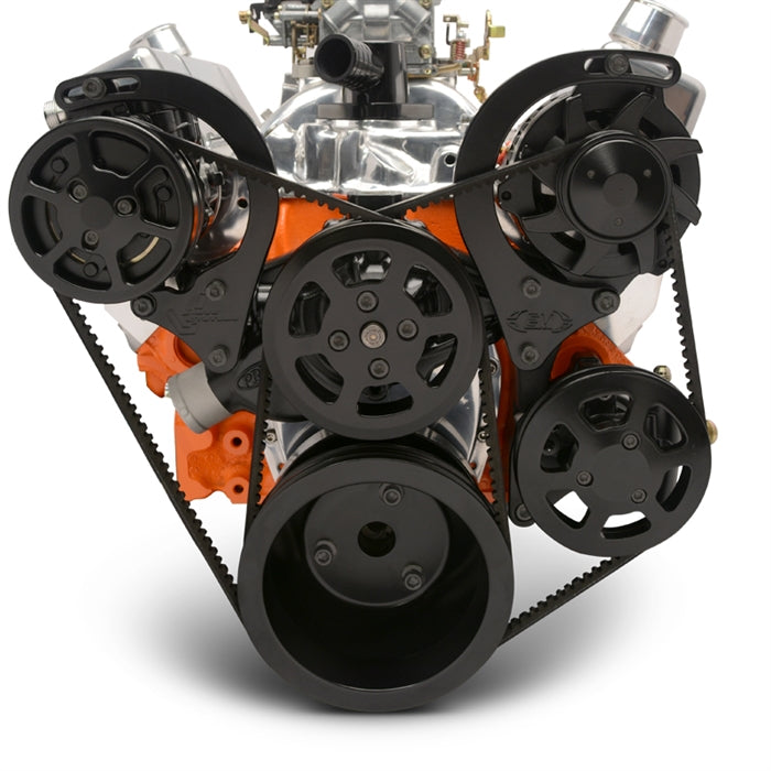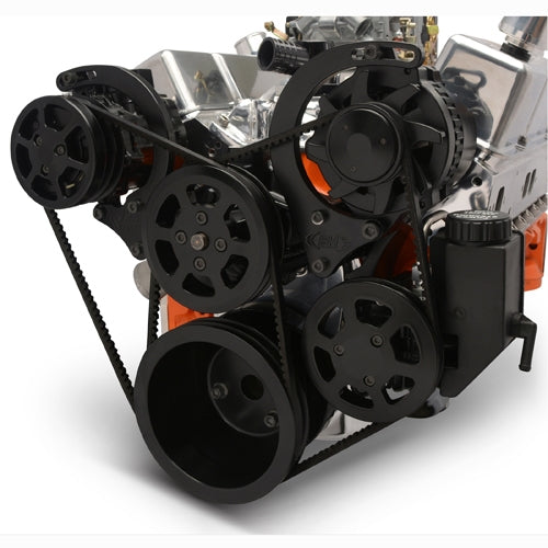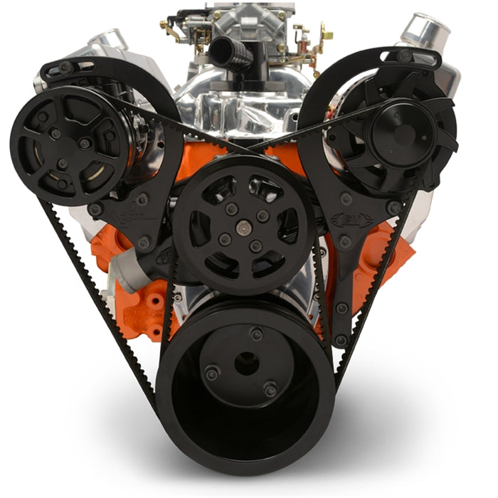 Our New V Drive Systems offer the same complete, compact design and simple installation as our popular Serpentine Drive systems at a more affordable price. One part number gives you everything you need to accessorize your engine with American made billet aluminum and new, name brand components. Kit is equipped to work with electric or mechanical fans.