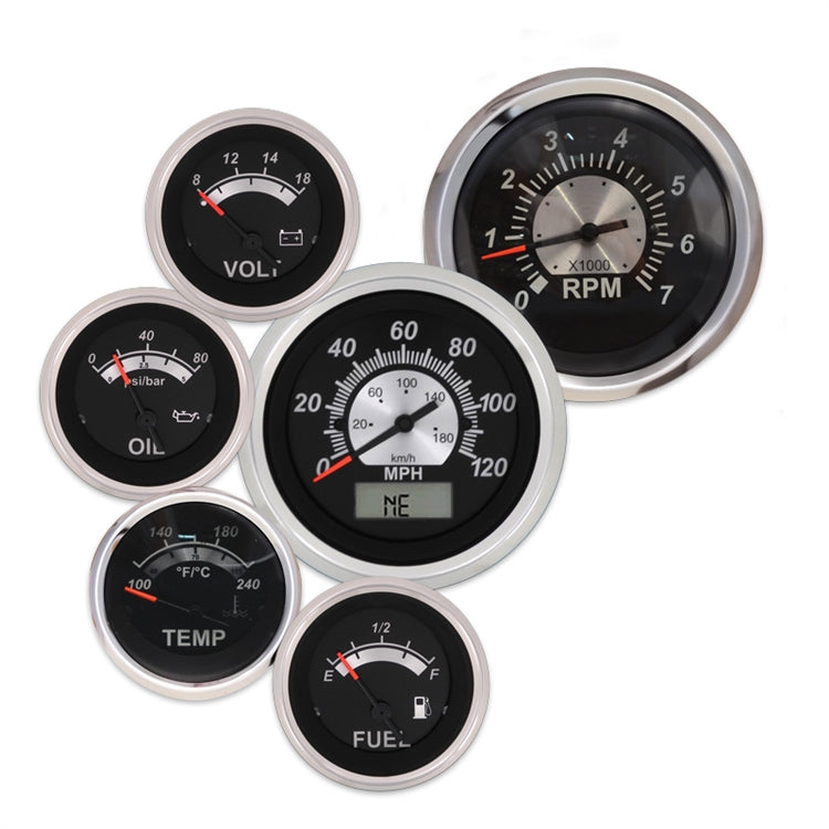 This six gauge kit includes a 120 MPH GPS controlled Speedometer and receiver that is accurate with any gear ratio or tire size and requires NO cables or transmission senders to function. Kits also include 7000 RPM tach, water temp and oil pressure gauges with senders, voltmeter, fuel level gauge compatible with Chevy senders, and a momentary function switch. Sizes: Tach and Speedometer are 3-3/8", smaller gauges are 2-1/16.