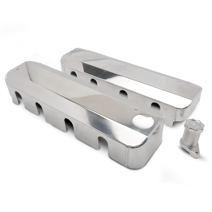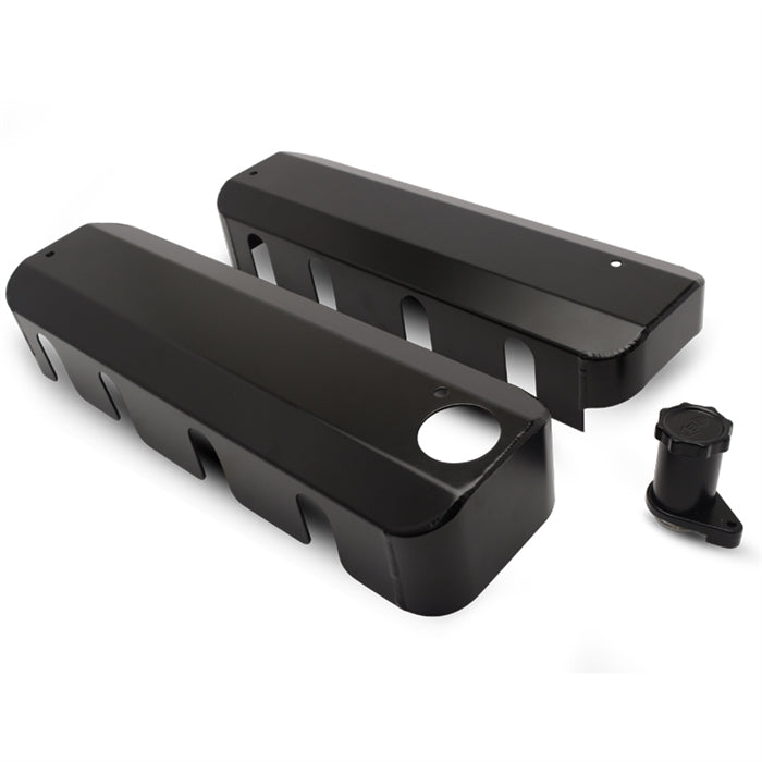 Dress-up your LS engine AND hide the stock coils with a set of these fabricated aluminum coil covers. Designed to look similar to a BB Chevy valve cover, the covers mount to the factory coil brackets and include a billet aluminum oil filter extension, screw-in cap and all of the necessary fasteners. Coil covers are 3 5/8" tall x 19 5/8" long, will fit 4.8L, 5.3L, 6.0L and 6.2L LS engines.
