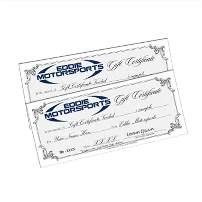 Give the gift of Eddie Motorsports and let your loved ones choose what they really want! Order multiple gift certificates to get your desired amount. Specify in the order notes the number of gift certificates and the specific amount for each.