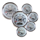 This six gauge kit includes a 120 MPH GPS controlled Speedometer and receiver that is accurate with any gear ratio or tire size and requires NO cables or transmission senders to function. Kits also include 7000 RPM tach, water temp and oil pressure gauges with senders, voltmeter, fuel level gauge compatible with Chevy senders, and a momentary function switch. Sizes: Tach and Speedometer are 3-3/8", smaller gauges are 2-1/16.