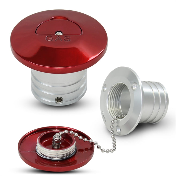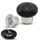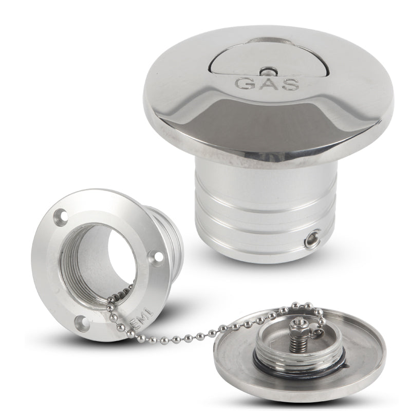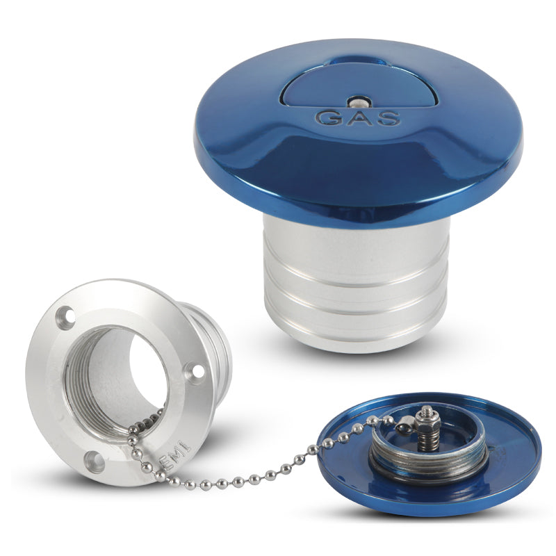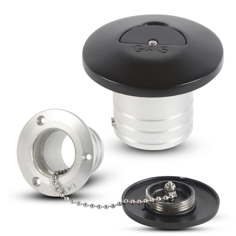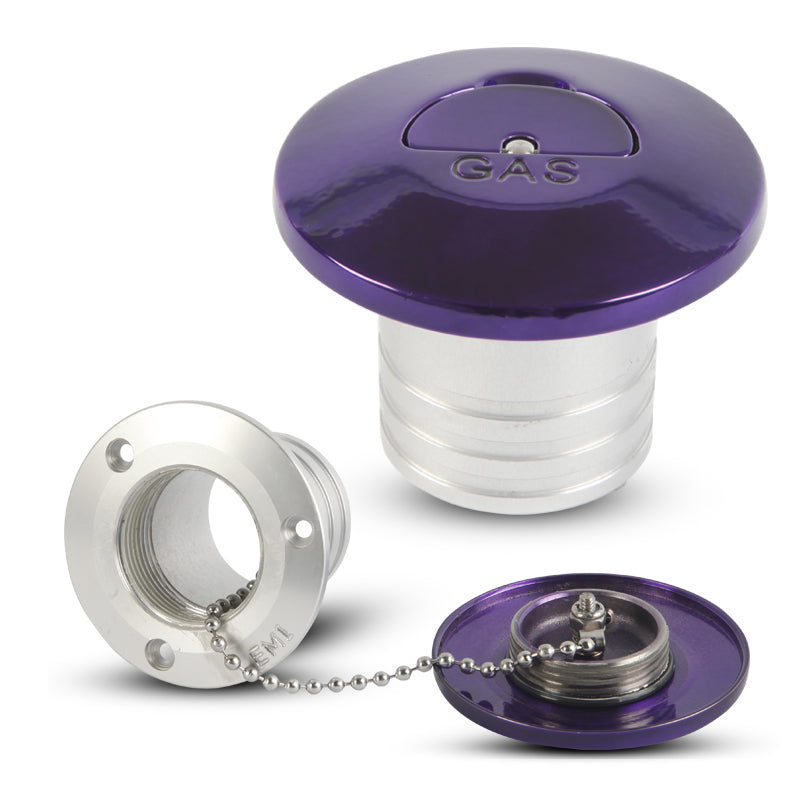 This gas cap has a very low profile and uses a cast stainless steel cap and a CNC machined billet aluminum base. The cap is removed by lifting and twisting the small flip tab. The fills are 3-1/2" diameter, vented, and available for use with 2" filler hose