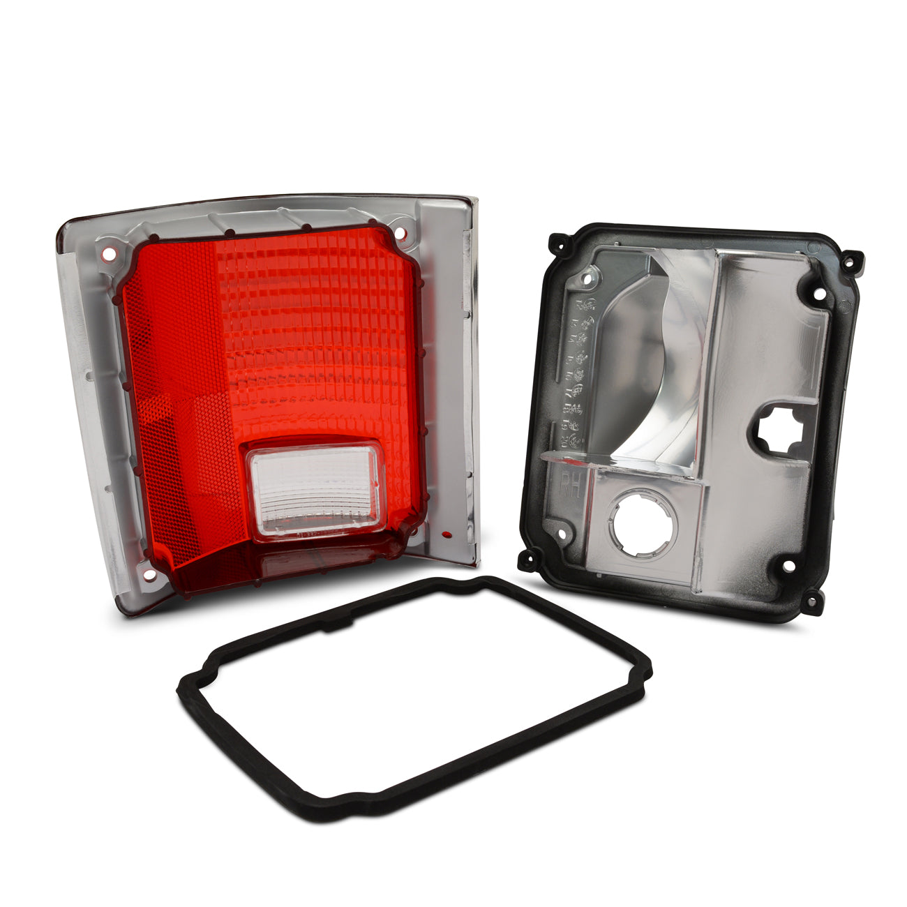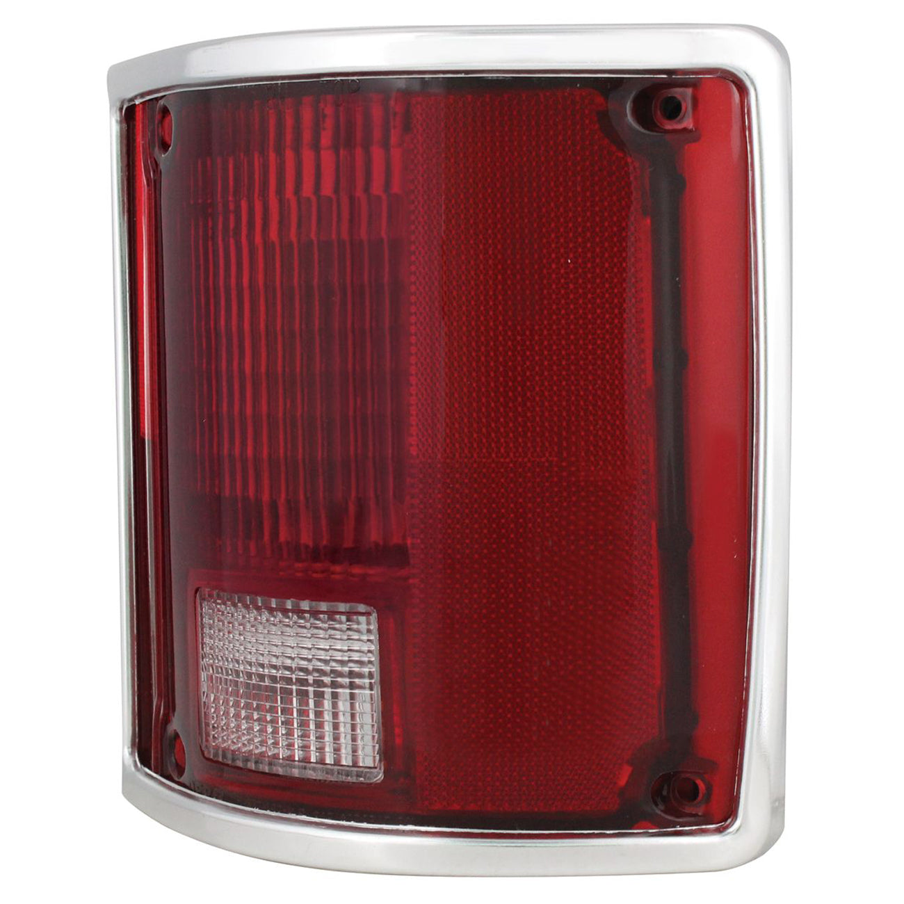 Replacement tail light assembly with trim for 1973-87 Chevy & GMC trucks, passenger side. These assemblies replace your stock lenses and feature a high quality polycarbonate lens with an anodized aluminum trim piece. They include the foam rubber gasket and work with your stock bulbs and socket assemblies (not included).
